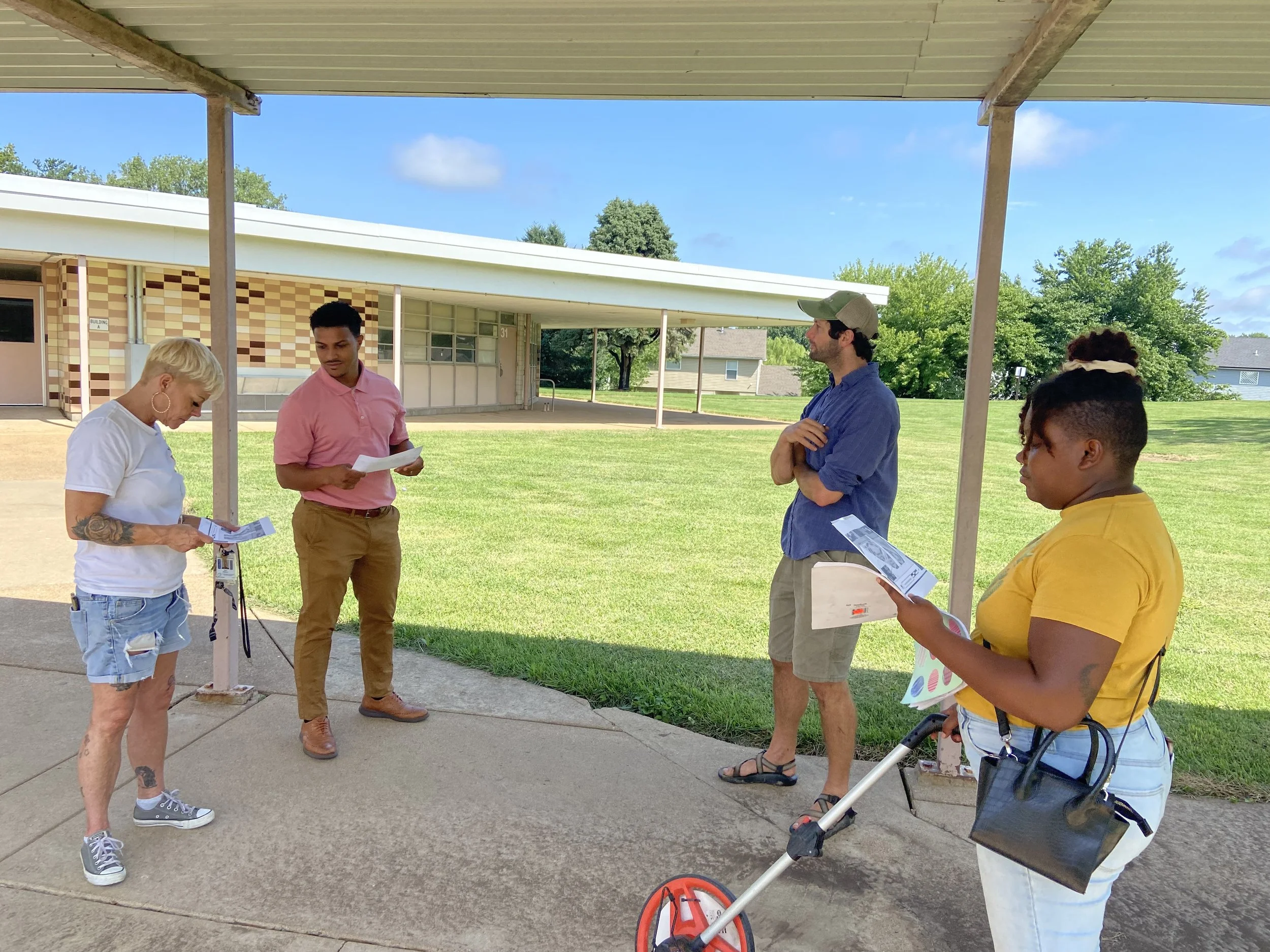 Our team took another step toward realizing the vision of the Permaculture Project of Metropolitan St. Louis earlier this August when we all gathered on the Restoration and Wellness campus in the Ferguson-Florissant School District. We came together with plans in hand, just days after tremendous rainfall and flash flooding in St. Louis made international news. Our plan was to discuss the garden design prepared by Custom Foodscaping founder Matt Lebon with input from the whole team, including Valaree Logan, Project Lab St. Louis’ lead gardener and school liaison, Isaiah Melendez, Principal of Restoration, and Pam Williams, lead caretaker on campus. Facing the reality of climate change head-on, our conversation began and ended on the subject of water.